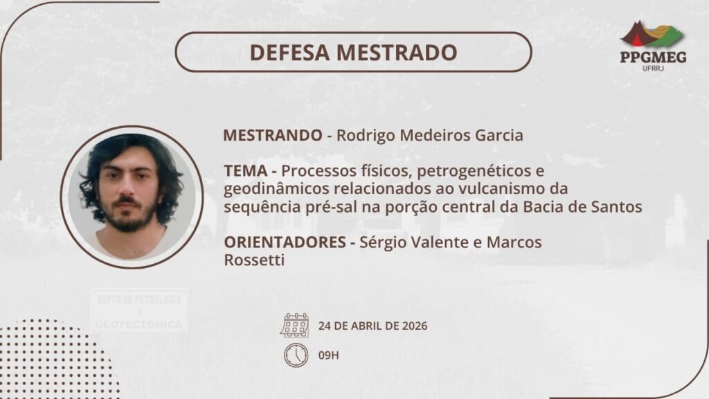 O Programa de Pós-Graduação em Geologia (PPGMEG) divulga a defesa de dissertação de mestrado do discente Rodrigo Medeiros Garcia, a ser realizada no dia 24 de abril, às 9h, com transmissão remota ao vivo pelo canal do YouTube do PPGMEG.